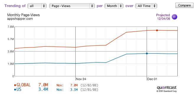 The site went from very little traffic to 100,000-130,000 daily pageviews in an instant. What’s striking about that graph is not that there was a big spike — any major exposure is going to get you a spike — but the “stickiness” of the site is remarkable. Usually there’s a substantial drop off after people hit a site in a big spike like that, but AppShopper retained a remarkable percentage of those people after the first visit. (There was recently a Black Friday spike that wasn’t nearly as sticky, but still showing a solid residual traffic).